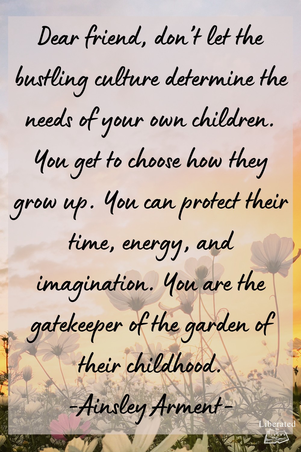 “Dear friend, don’t let the bustling culture determine the needs of your own children. You get to choose how they grow up. You can protect their time, energy, and imagination. You are the gatekeeper of the garden of their childhood” —Ainsley Arment