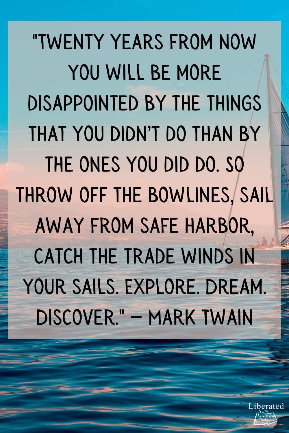 “Twenty years from now you will be more disappointed by the things that you didn’t do than by the ones you did do. So throw off the bowlines, sail away from safe harbor, catch the trade winds in your sails. Explore. Dream. Discover.” — Mark Twain
