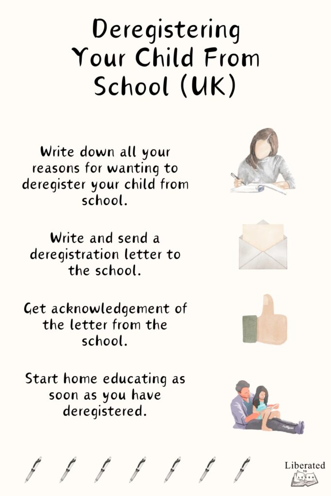 Once you’ve made the decision to home educate, deregistering is simply taking your child’s name off of the school register. This is done by a letter of request and informing the school that you will now be home educating your child.