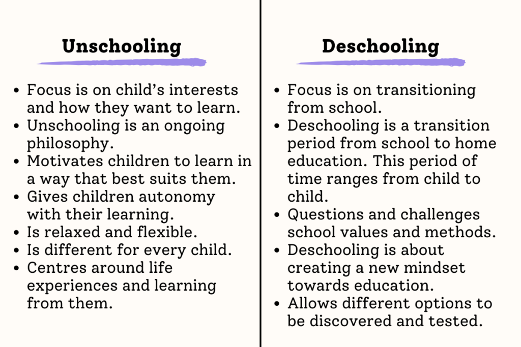 To elaborate, unschooling allows children to learn naturally through life experiences, without a structured curriculum or formal lessons. On the other hand, deschooling is the transitional process of adjusting from a formal, school-based mindset to a more relaxed, self-directed approach to learning. It often occurs when a child leaves a traditional school setting and needs time to unlearn rigid expectations and schedules, and rediscover their natural curiosity.